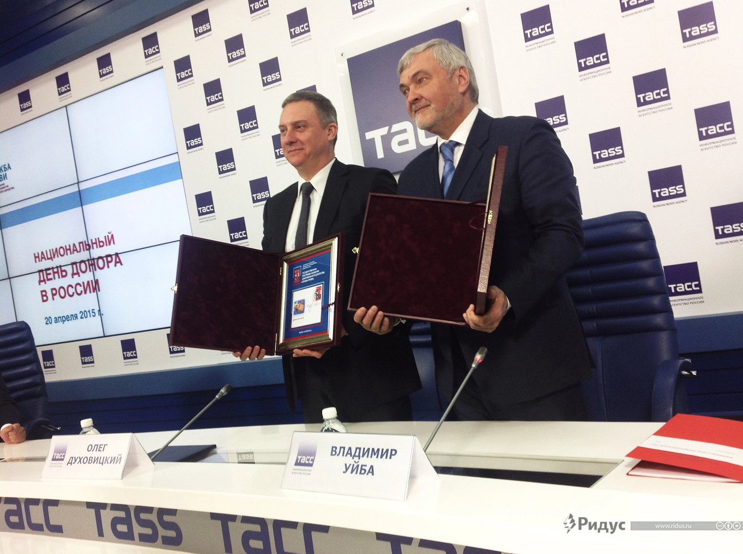 Руководитель Федерального агентства связи Олег Духовницкий и руководитель ФМБА Владимир Уйба в ходе пресс-конференции погасили марки, выпуск которых приурочен к 50-летию со дня выхода серии почтовых марок «Донорство в СССР».