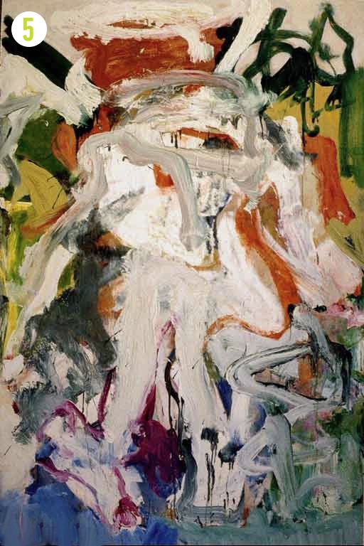 Далее (номер пять) следует работа Виллема де Кунинга, которого величают «одним из лидеров абстрактного экспрессионизма». Творение носит название «Женщина в пейзаже». Отделить муху от котлеты… а точнее женщину от пейзажа, предлагаем вам самостоятельно.