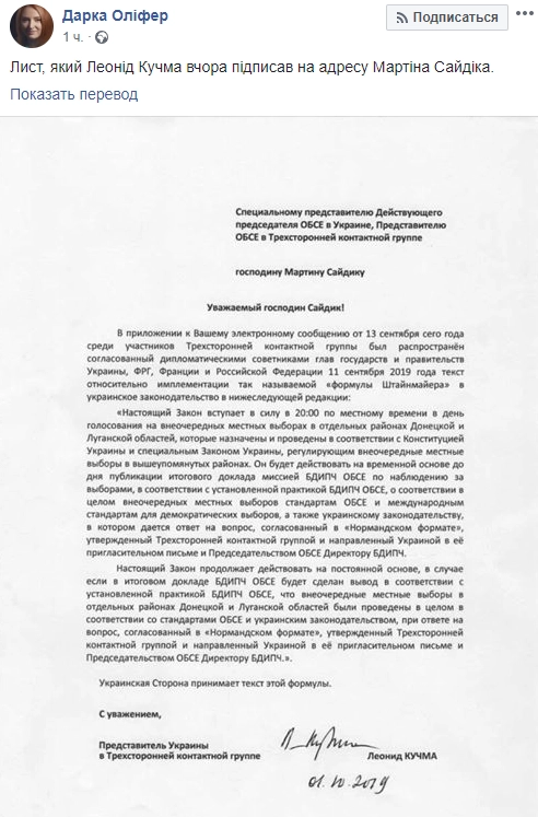 Текст письма на имя спецпредставителя ОБСЕ Мартина Сайдика приведен полностью. В заключение подчеркивается, что украинская сторона принимает текст этой формулы, который был согласован дипломатическими советниками глав государств и правительств Украины, ФРГ, Франции и РФ 11 сентября относительно «имплементации так называемой формулы Штайнмайера в украинское законодательство».