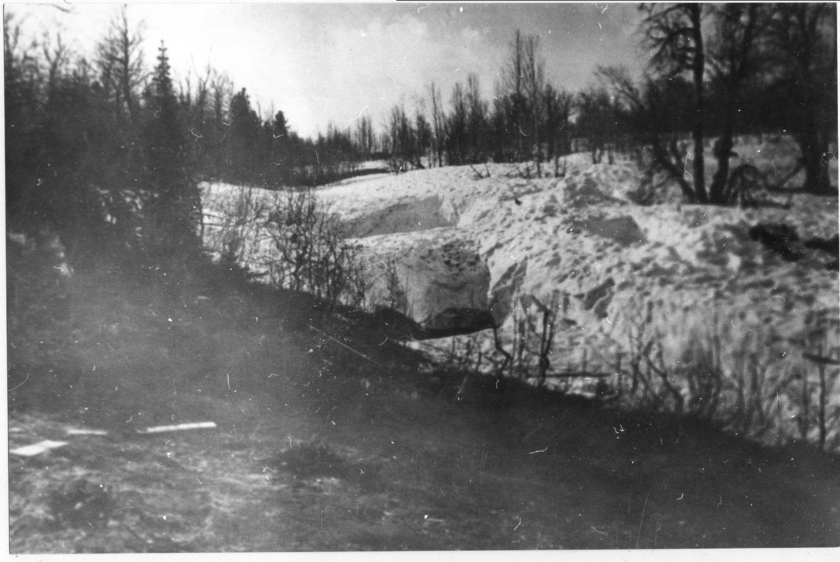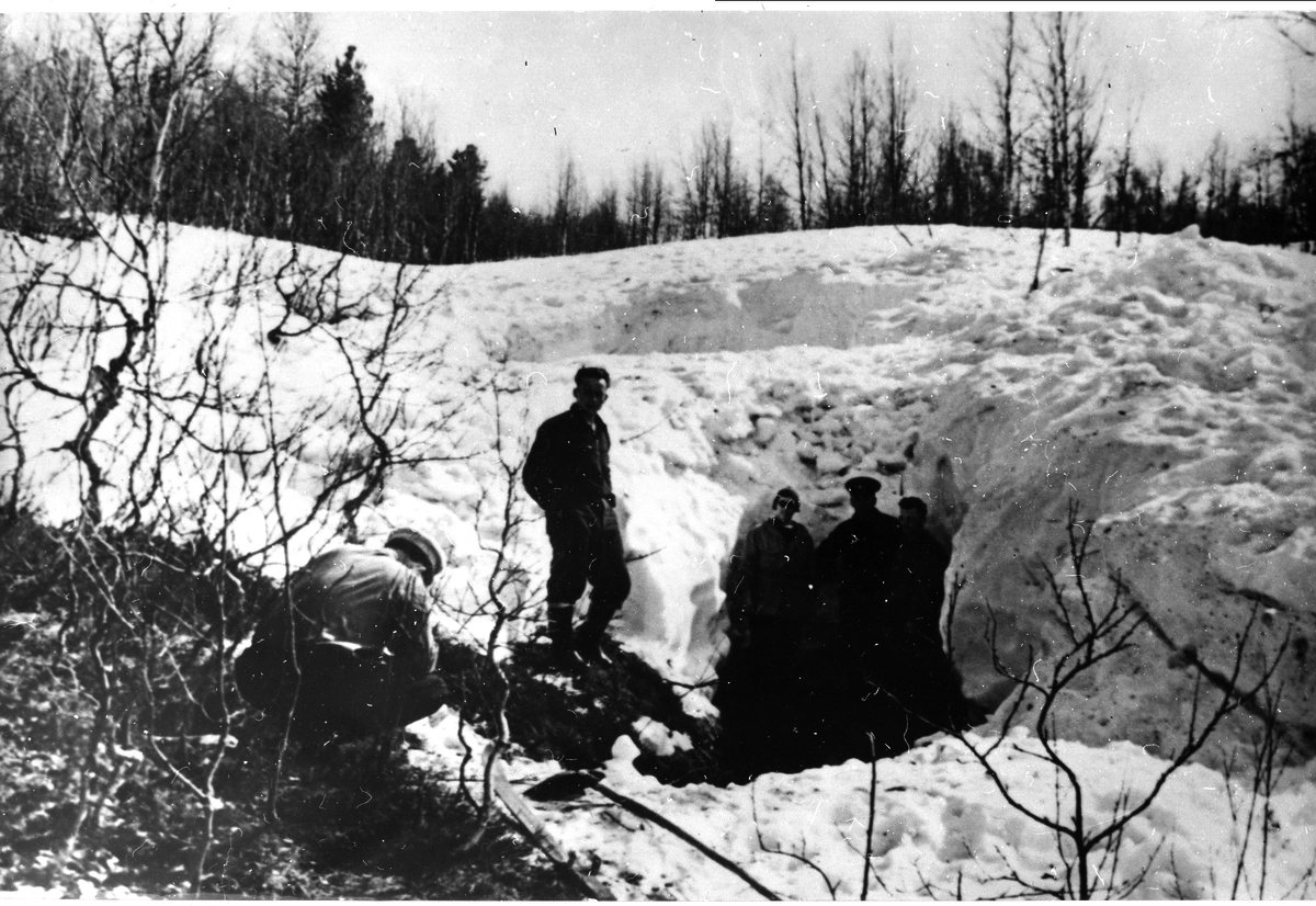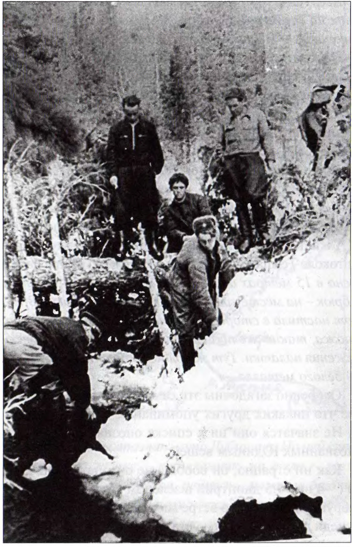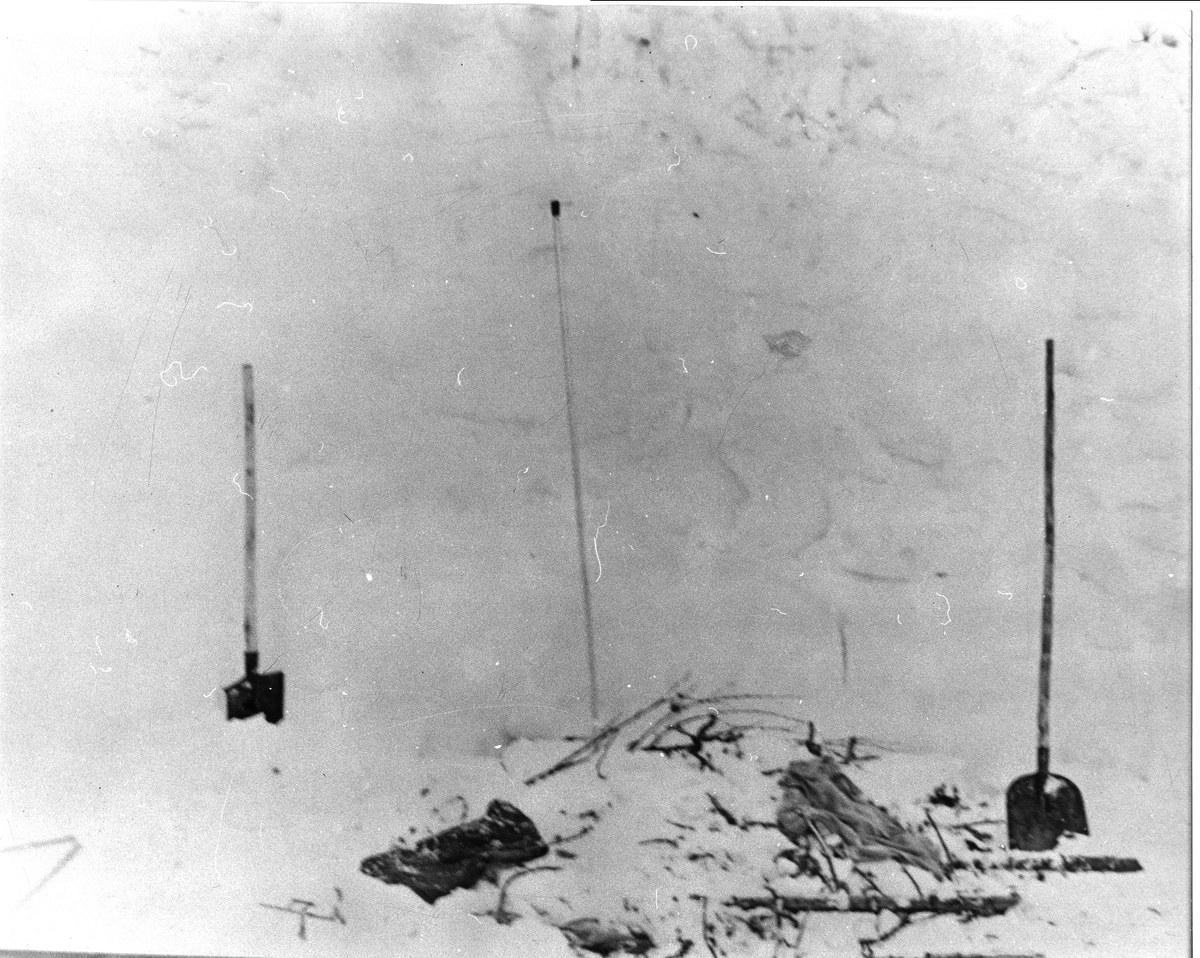 Ещё одна загадочная фотография. Тоже поисковые работы. Скорее всего, это март 1959 года. Осматривают какую-то яму в снегу. Видны части каких-то досок, возможно под снегом лежат лоскуты какой-то ткани. По мне так это все похоже на парашют. А в самой яме чей-то труп?!