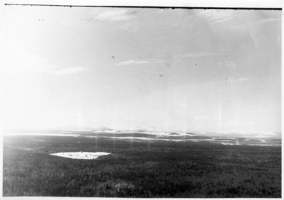 Необычные явления природы во время поисковых работ. Фотография так же ранее широко не публиковалась. Над лесом стоят непонятные световые столбы. На брак пленки не похоже. Причина данного природного явления мне не известна.