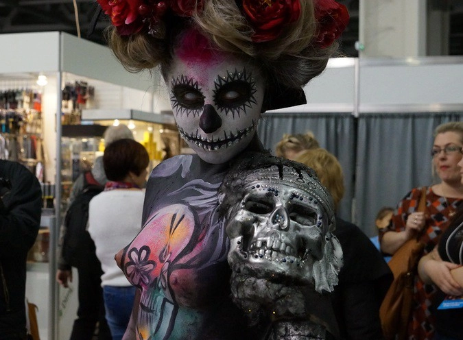 Лучшей, на взгляд большинства посетителей оказалась работа, выполненная в инфернальных тонах с черепами и прочей «жизнеутверждающей» атрибутикой. По всей видимости, автор и модель находились под впечатлением проходящего в это время Хеллоуина.