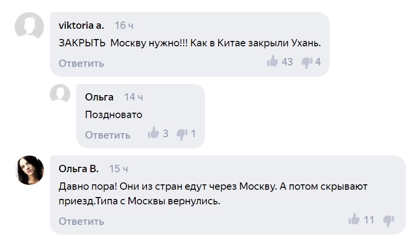 Некоторые высказались о том, что Москва и Санкт-Петербург невольно стали очагами распространения смертельно опасной инфекции. Все спецрейсы с российскими туристами, оказавшимися в странах с неблагоприятной эпидситуацией, возвращались именно в столичные аэропорты.