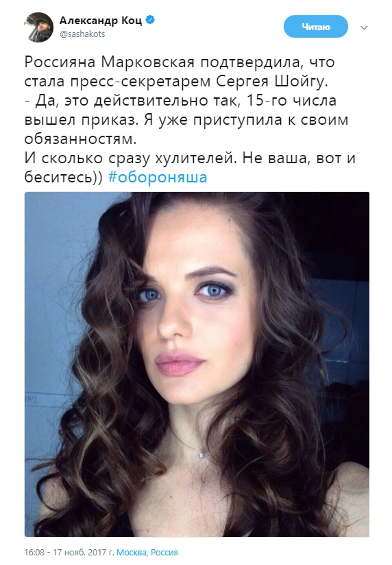 Новым пресс-секретарем Министерства обороны стала бывшая журналистка телеканала «Звезда» 26-летняя Россияна Марковская. Яркая внешность и патриотичное имя девушки стали предметом горячего обсуждения в интернете.