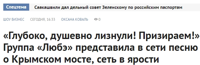 Украинские СМИ жестко раскритиковали новый клип группы «Любэ», посвященный Крымскому мосту. На российских музыкантов, опубликовавших свою работу на YouTube, горой посыпались оскорбления.