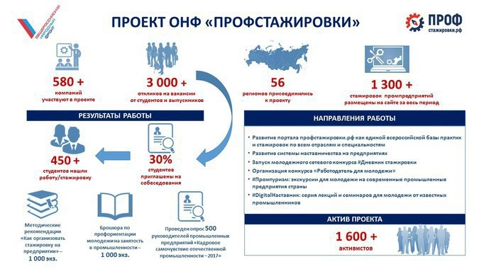 Отсутствие опыта — это оновная причина сложностей с поиском работы. Наш проект, помогающий выпускникам и студентам вузов находить стажировки, помогает разорвать этот замкнутый круг. В первую очередь мы акцентировались на теме кадров для промышленности. Сейчас у нас в плане создать всероссийскую базу стажировок. В нашей распоряжении уже 4,5 тысяч объявлений, и в большинстве из них речь идет об оплачиваемых стажировках,говорит Семин.