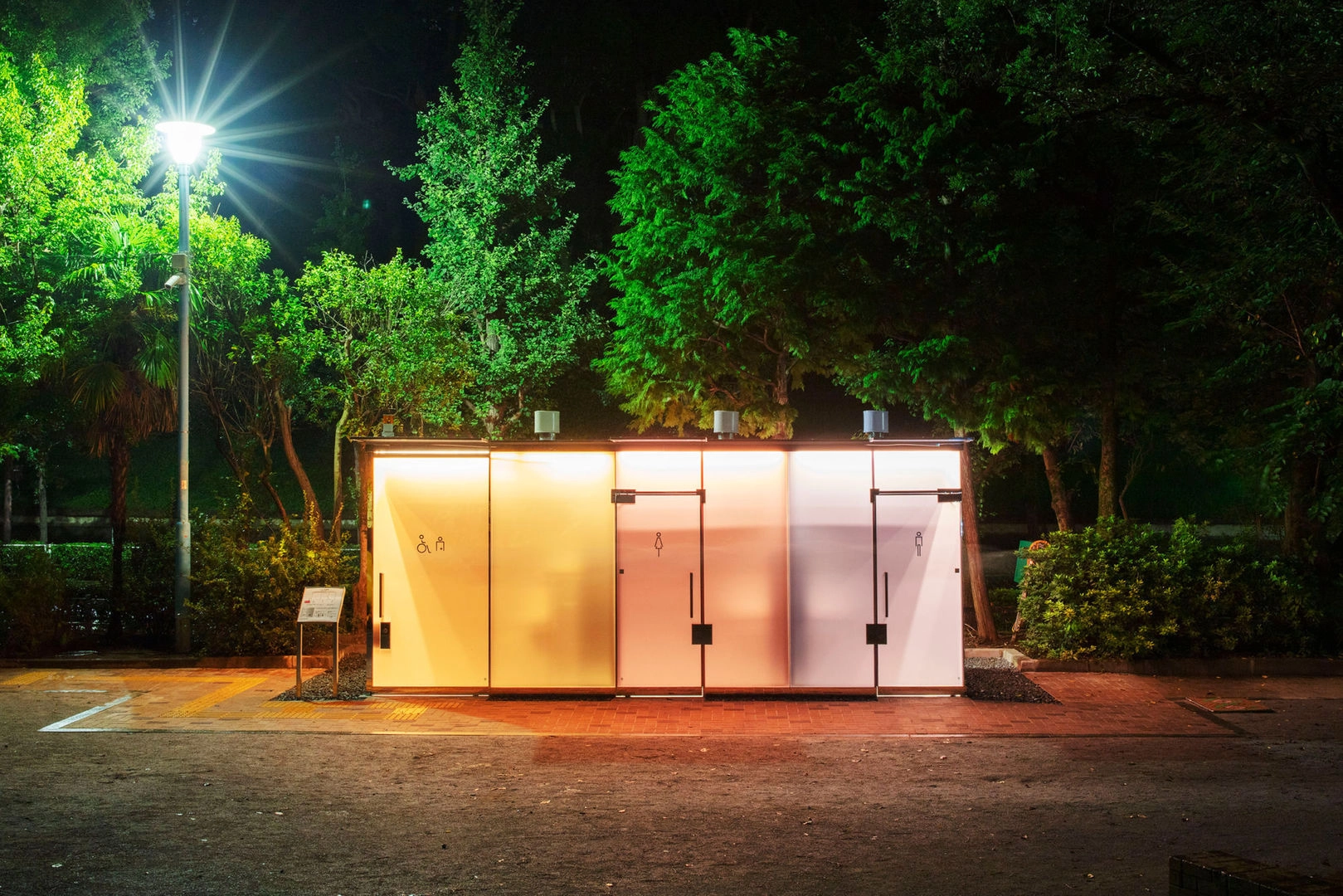 Кроме того, помимо своей главной функции, высокотехнологичные туалеты служат еще и в качестве фонарей. В темное время суток их подсветка освещает дорожки в парках.