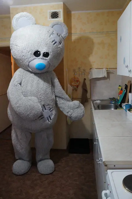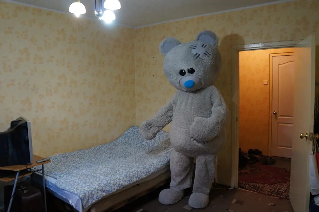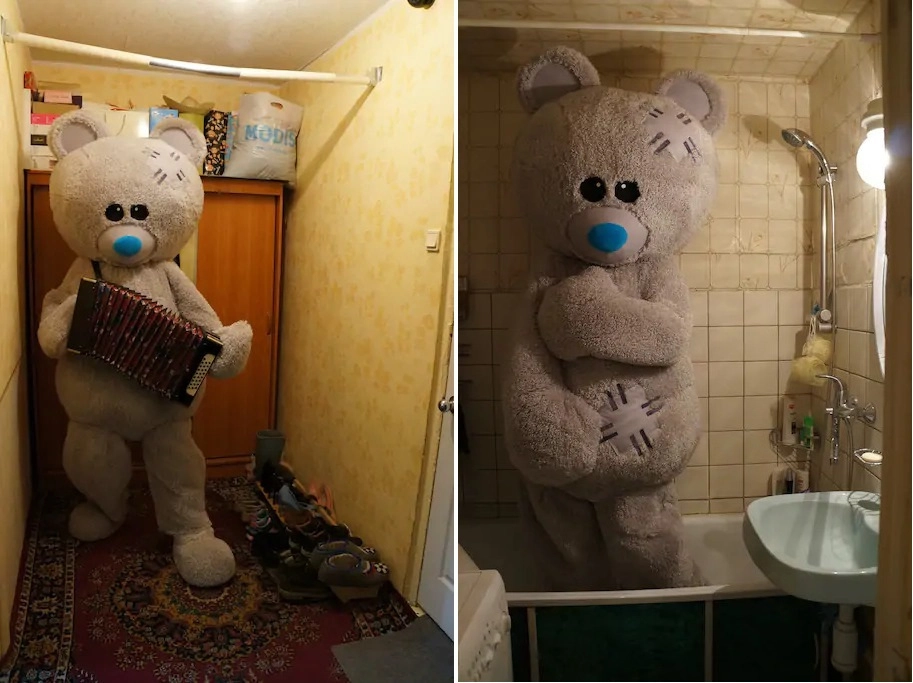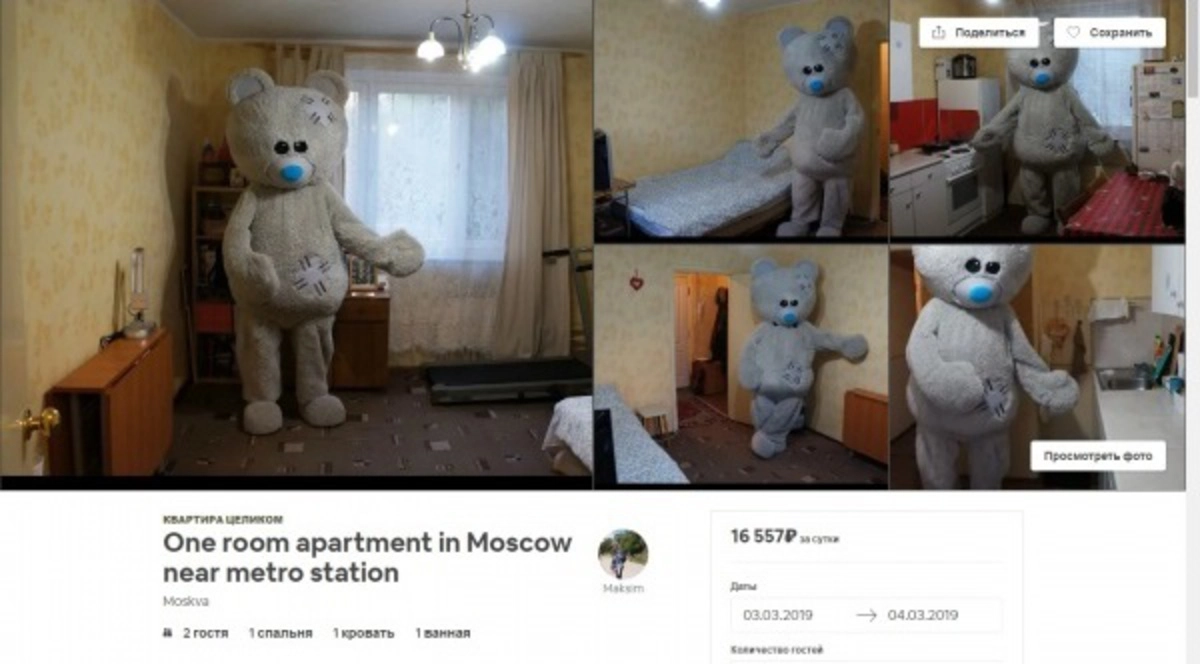 Внимание пользователей соцсетей привлекло объявление москвича о сдаче квартиры в посуточную аренду на портале Airbnb. Дело в том, что на фотографиях в каждой комнате стоит большой плюшевый медведь: в коридоре он держит в лапах гармонь, в ванной стыдливо прикрывается, в спальне гостеприимно показывает на кровать. Однако оригинальная задумка напугала Рунет, уж больно жутко выглядит огромный мишка в потрёпанной квартире.