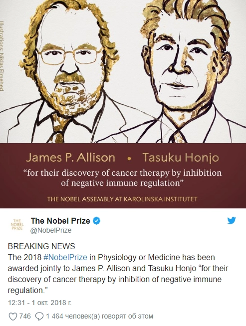 Премия присуждена Джеймсу Эллисону и Тасуку Хондзё за исследования в области терапии рака.