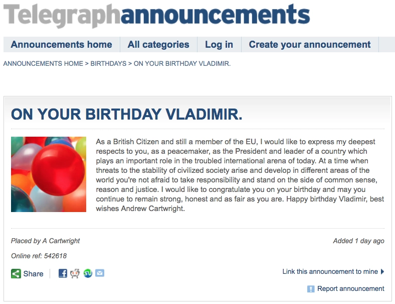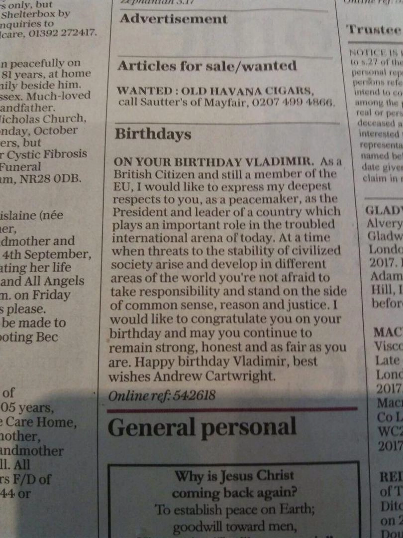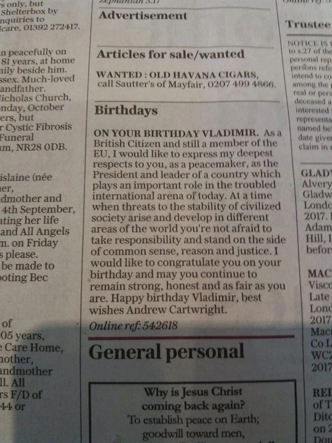 Британец по имени Эндрю Картрайт опубликовал в лондонском издании The Telegraph поздравление в адрес Владимира Путина по случаю его 65-летия.