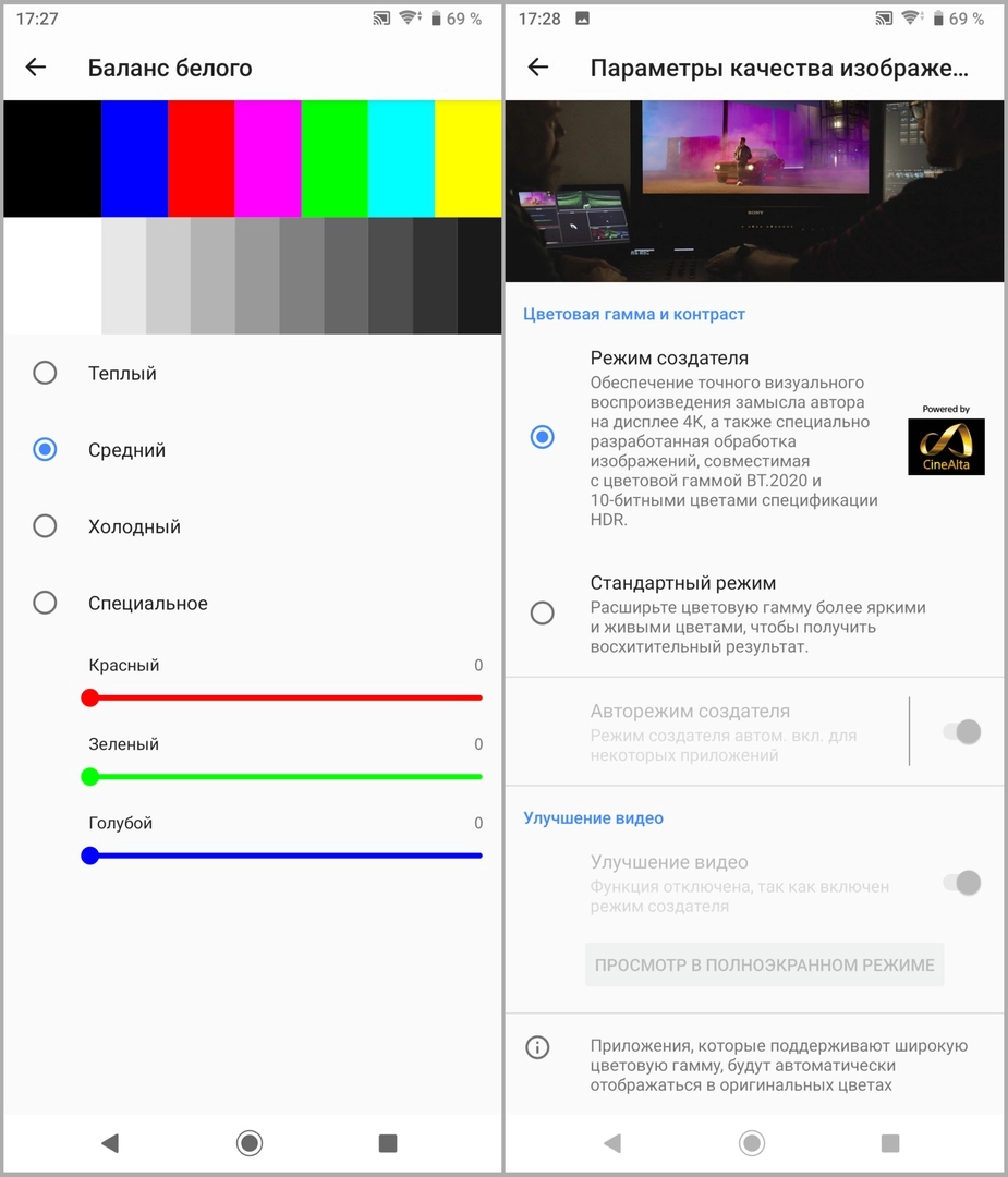 В настройках можно выбрать цветовой профиль, среди которых есть «Режим создателя». В нем изображение соответствует стандарту ITU-R BT.2020, предназначенному для профессиональной обработки: картинка такая, какой ее задумали авторы.