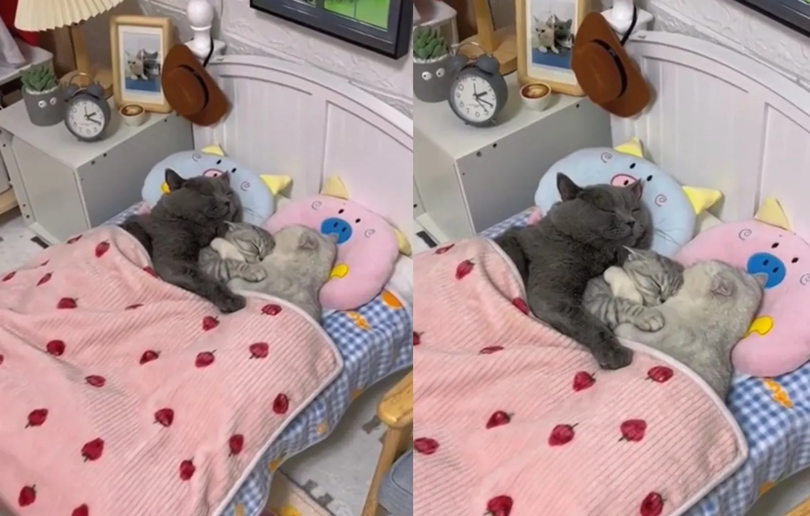 Если вы нуждаетесь в большой дозе милоты, способной поднять настроение до небес, взгляните на очаровательное кошачье семейство из этого ролика. Пушистики легли спать совсем как люди — положили головы на подушки, крепко обнялись и накрылись одеялком.