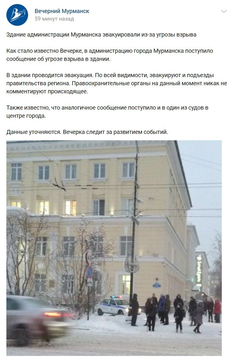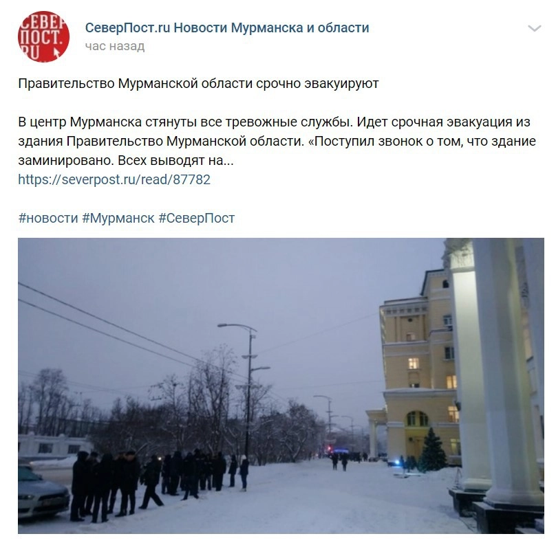 Также появилась информация об эвакуации из-за угрозы взрыва здания правительства Мурманской области.