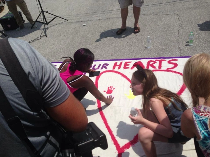 В окрестностях гей-клуба жители города организовали импровизированную акцию памяти: отпечатки своих ладоней под надписью «Сегодня наши сердца плачут» оставляют и дети, и взрослые.