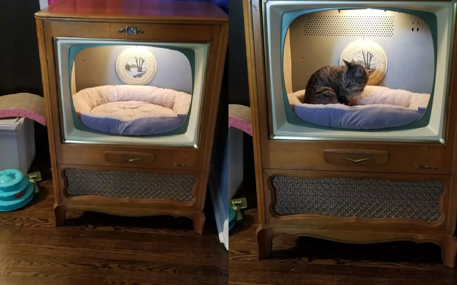 Недавно на гаражной распродаже мужчина приобрел винтажный телевизор, из которого сделал домик для кошки дочери по кличке Мифа. В домике есть мягкая лежанка, маленькая картина для уюта и даже освещение, яркость которого можно регулировать с помощью ручки на передней панели телевизора.
