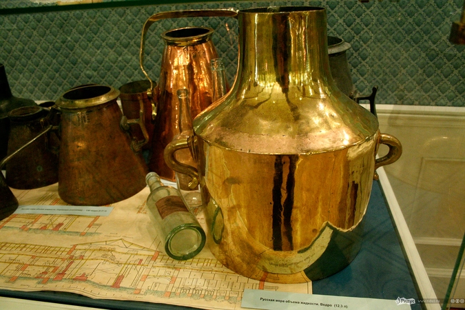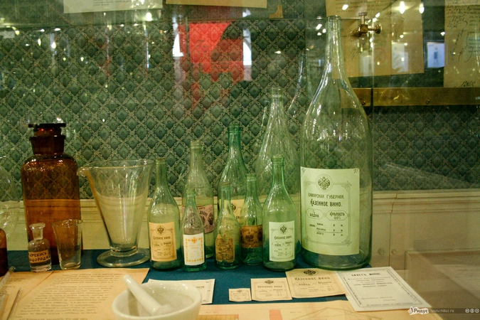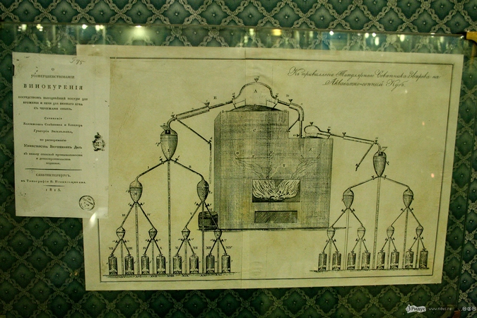 «Хор наш поет тебе любимый и вино течет рекой…» — это стенд с первыми лафитничками, четвертями и ведрами пузатыми, квадратными и даже конусообразными. Здесь же прошения, ходатайства и сертификаты на изготовление под строгим надзором государства казенного или столового вина, как тогда называли водку.