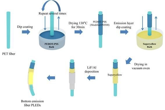 Изготовление светодиодных нитей начинается с «полоскания» волокон полиэтилентерефталата в растворе из специального полимера, затем их сушат при температуре 130° С. После этого материал помещают в супержелтый раствор, формирующий светодиоды, снова сушат, а затем покрывают нити составом из фтористого лития и алюминия.