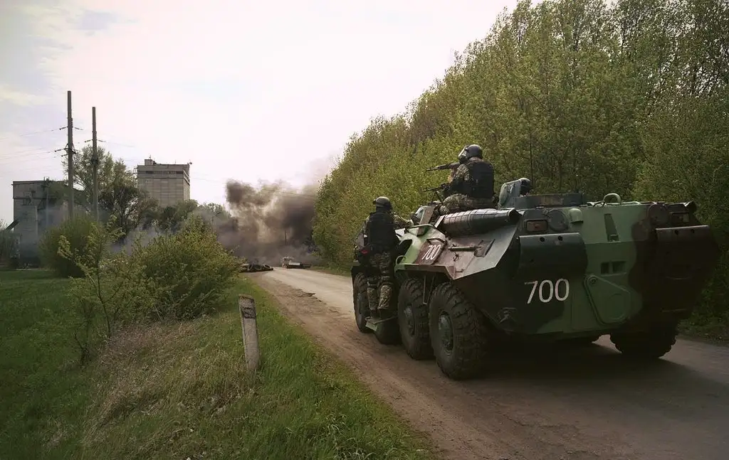 Несколько единиц брони ВСУ выскочило на блок-пост Химик, сбили нашу заставу и тут их заклинило — идти в город они откровенно забоялись. Начали подтягиваться местные жители. На первом снимке я стою, Саша Коц присел на корточки и в нас целится какой-то смелый пулеметчик. На втором снимке — укропская бронегруппа.