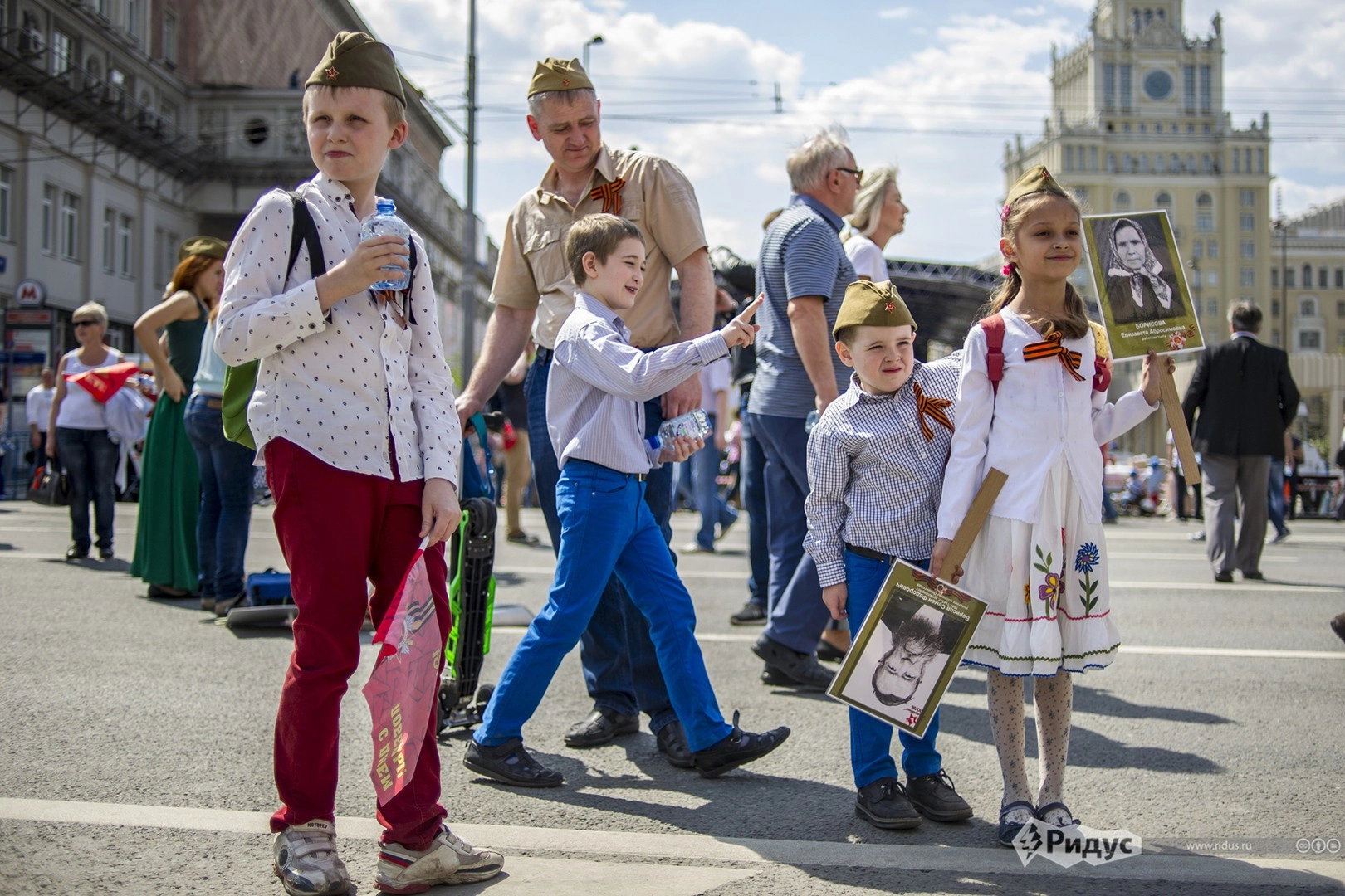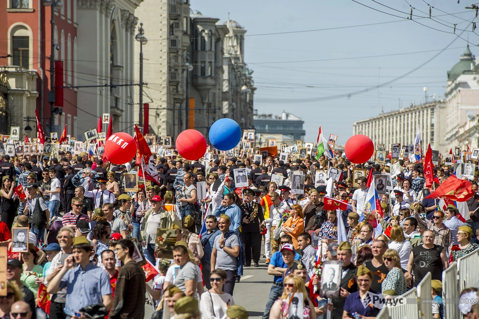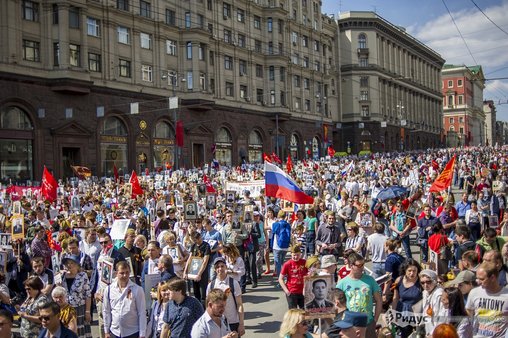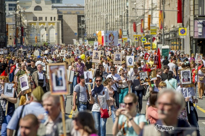 Несмотря на длинные праздники и хорошую летнюю погоду, далеко не все москвичи отправились на дачи. Подземка буквально забита людьми в пилотках со звездами, с красными флагами и портретами воевавших предков.