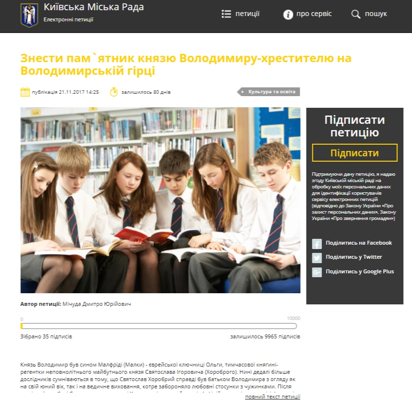 Петицию разместили на сайте киевской рады чуть больше недели назад. За это время ее подписали 35 человек. А чтобы инициативу рассмотрели в Киевсовете необходимо собрать не менее 10 000 подписей за 3 месяца.