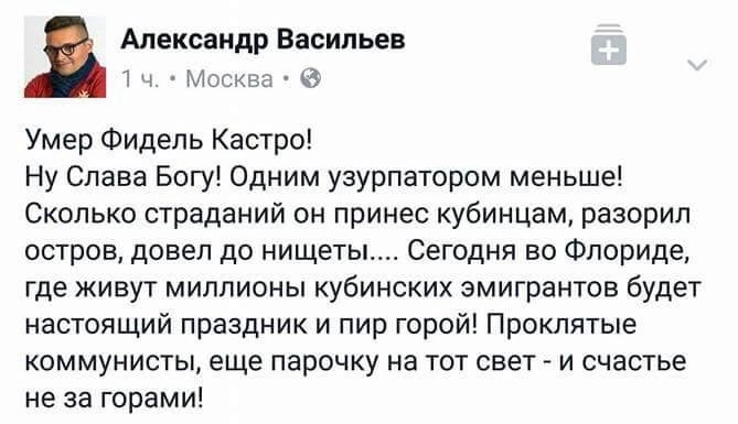 Именно сегодня, когда весь мир соболезновал кубинцам из-за утраты Команданте, на своей странице г-н Васильев выложил радостный пост про смерть 90-летнего революционера. Не прошло и несколько часов, как многие пользователи зашли на страничку к «историку моды» и высказали всё, что они о нем думают. Вскоре, «историк моды» свой пост трусливо удалил. Но буквально через некоторое время, через одну из своих подруг, он признался, что его страницу взломали.