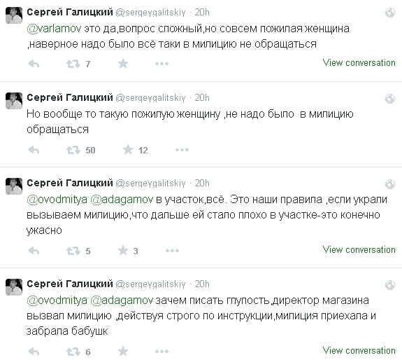 Ранее Галицкий заявил, что директор магазина, вызывая сотрудников правопорядка, действовал строго по инструкции. Позже он, впрочем, признал, что в случае с пожилой женщиной полицию вызывать не стоило.