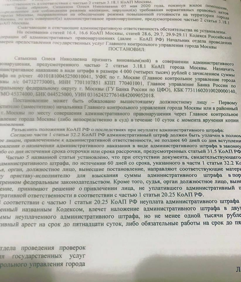 Жительница Москвы Олеся Сазыкина удостоилась от столичного Главного контрольного управления целой серии штрафов за «нарушение режима самоизоляции», хотя всего лишь выезжала по своей надобности, используя пропуска.