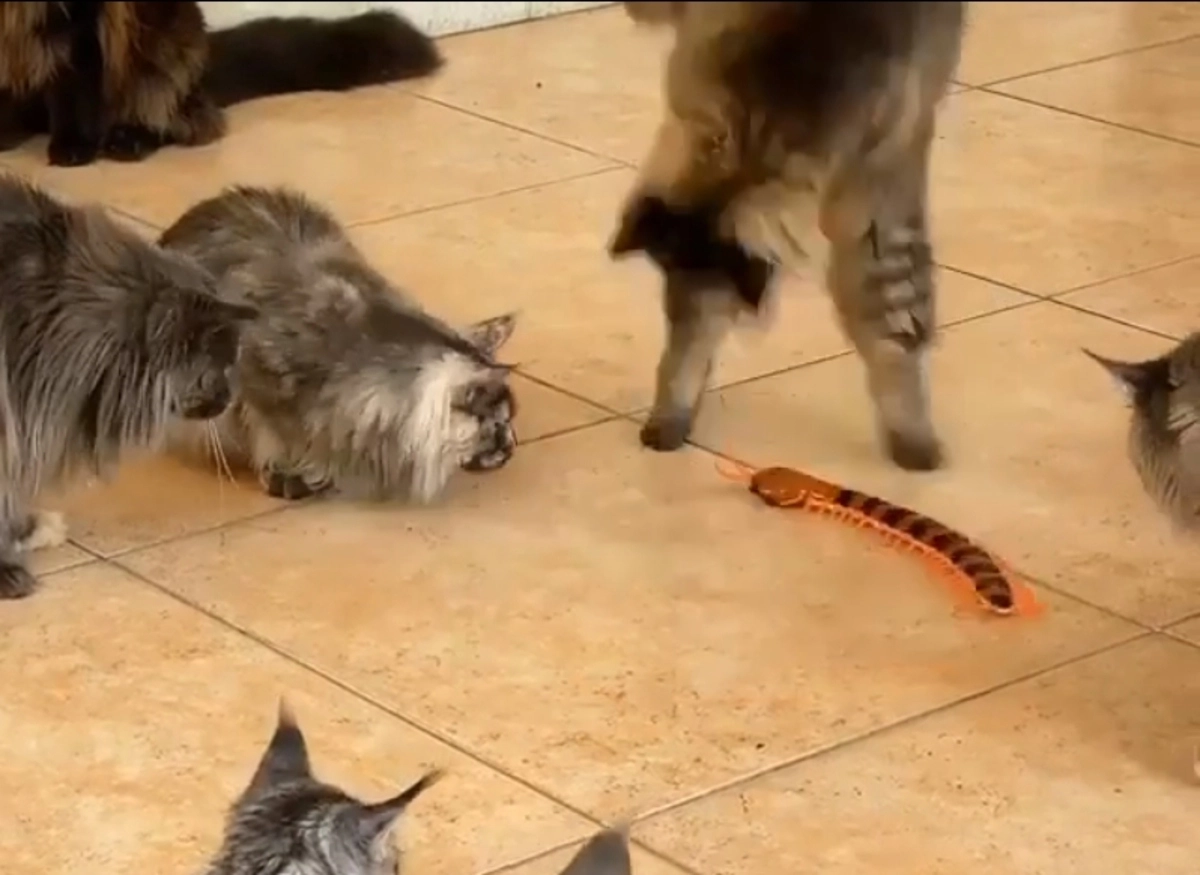 Игрушечная многоножка внушительных размеров заставила группу котов изрядно поволноваться.