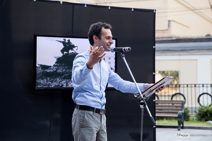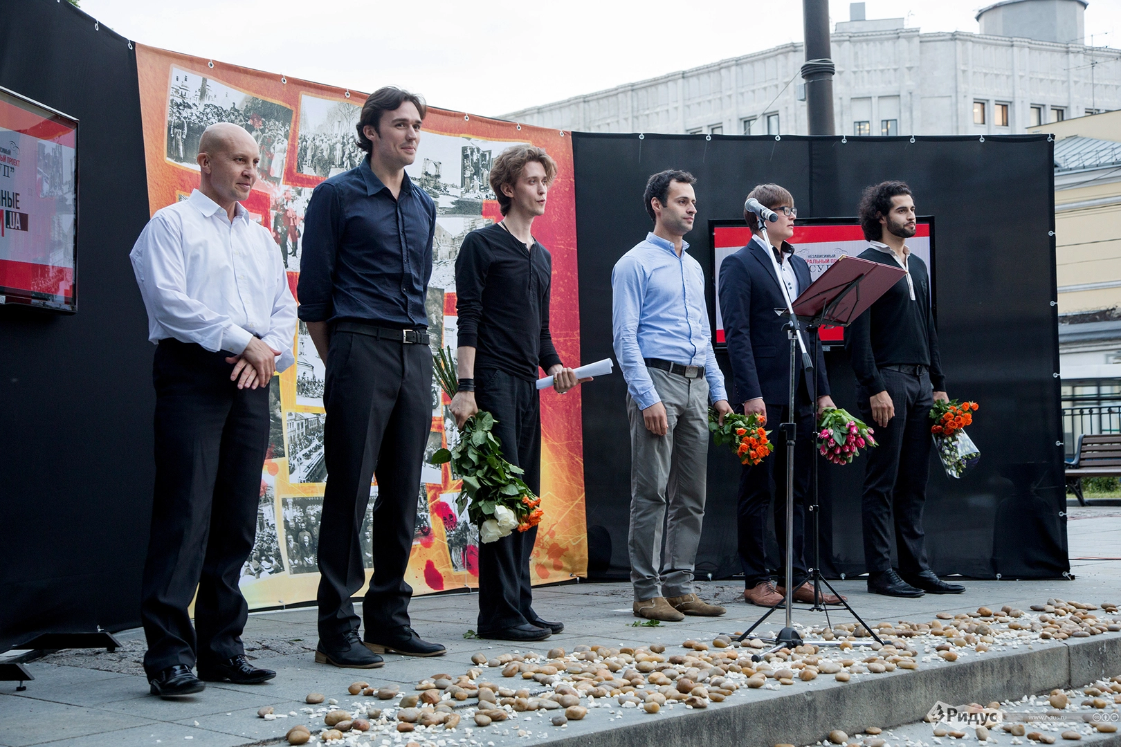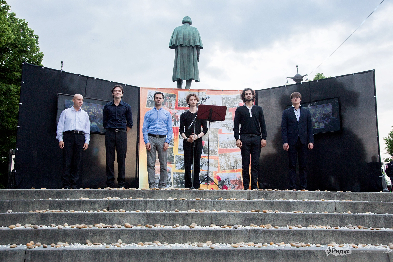 На ступенях перед памятником Н.В. Гоголя, засыпанных морской галькой, актеры московских театров прочли слова свидетелей гражданской войны на Украине в 1918-1919 гг. Документальные записи и впечатления Бунина из дневника «Окаянные дни», Булгакова из фельетона «Киев-город» и Гетмана Скоропадского о трагических событиях в Киеве и Одессе чередовались с лирикой Анны Ахматовой в стихотворениях «Мужество» и «О Киеве».