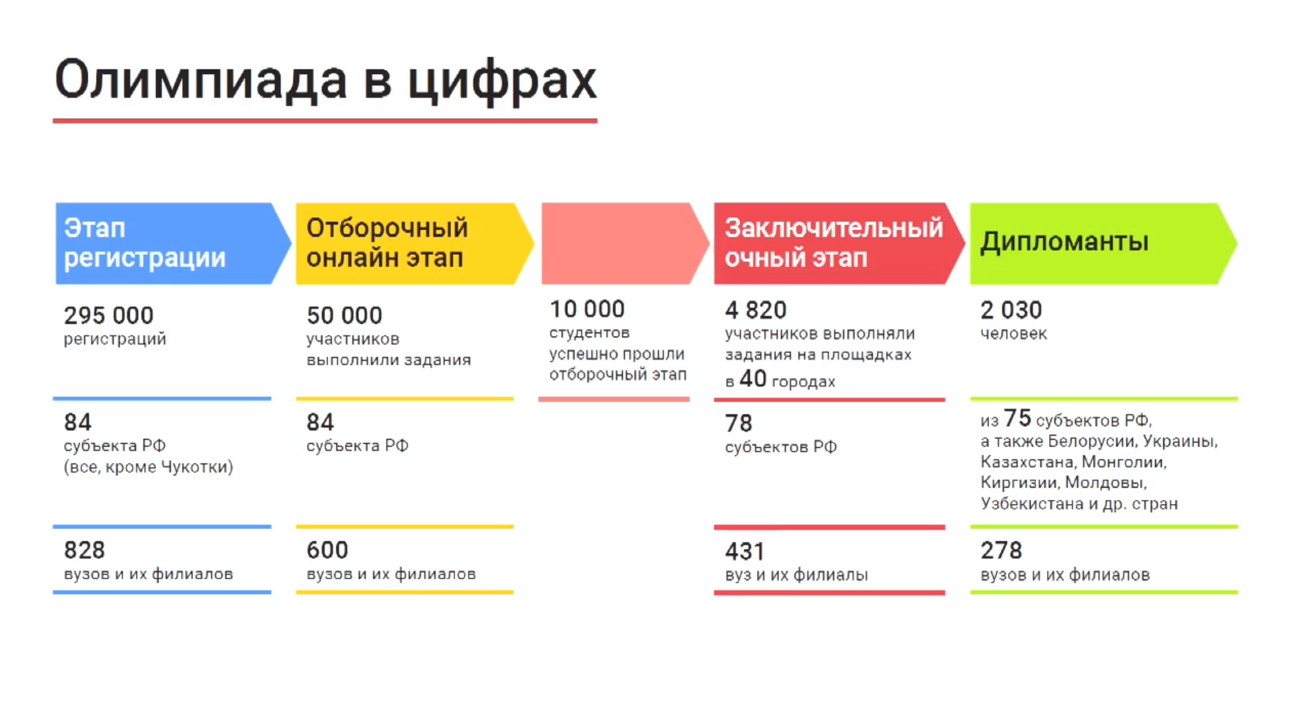 В Москве подвели итоги первой студенческой олимпиады «Я — профессионал», в которой принимали участие более 200 тысяч учащихся вузов из всех регионов страны. Победителей, а это 248 человек, ждут денежные призы, льготы при поступлении в магистратуру и аспирантуру, а также стажировки в крупнейших компаний России.