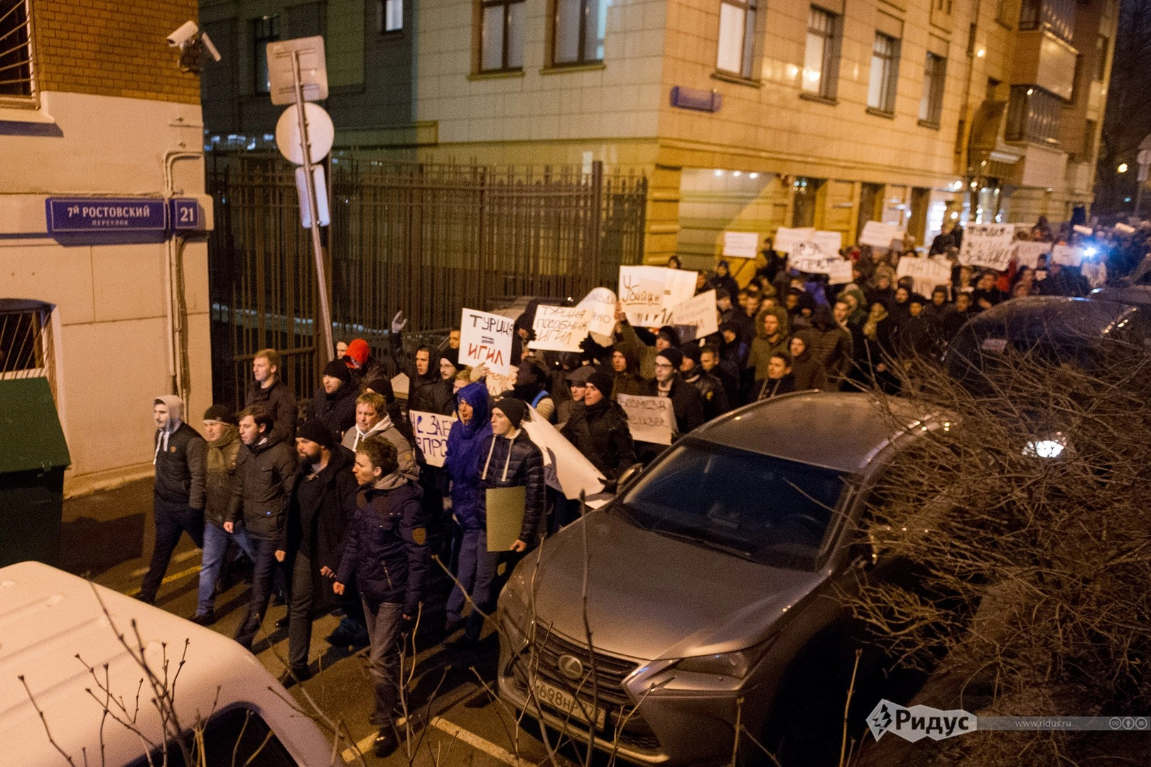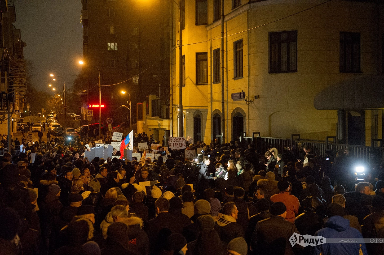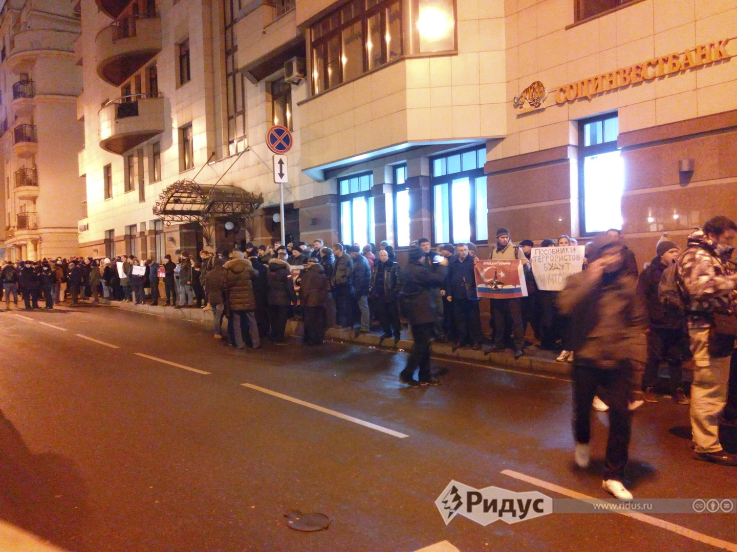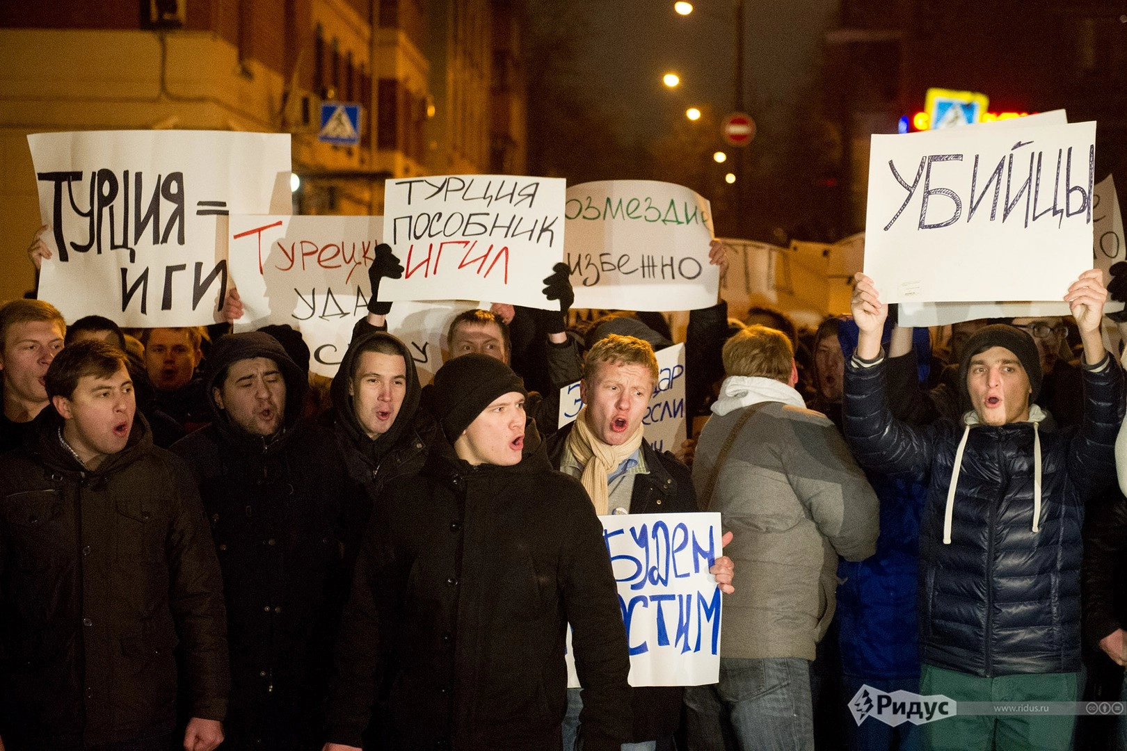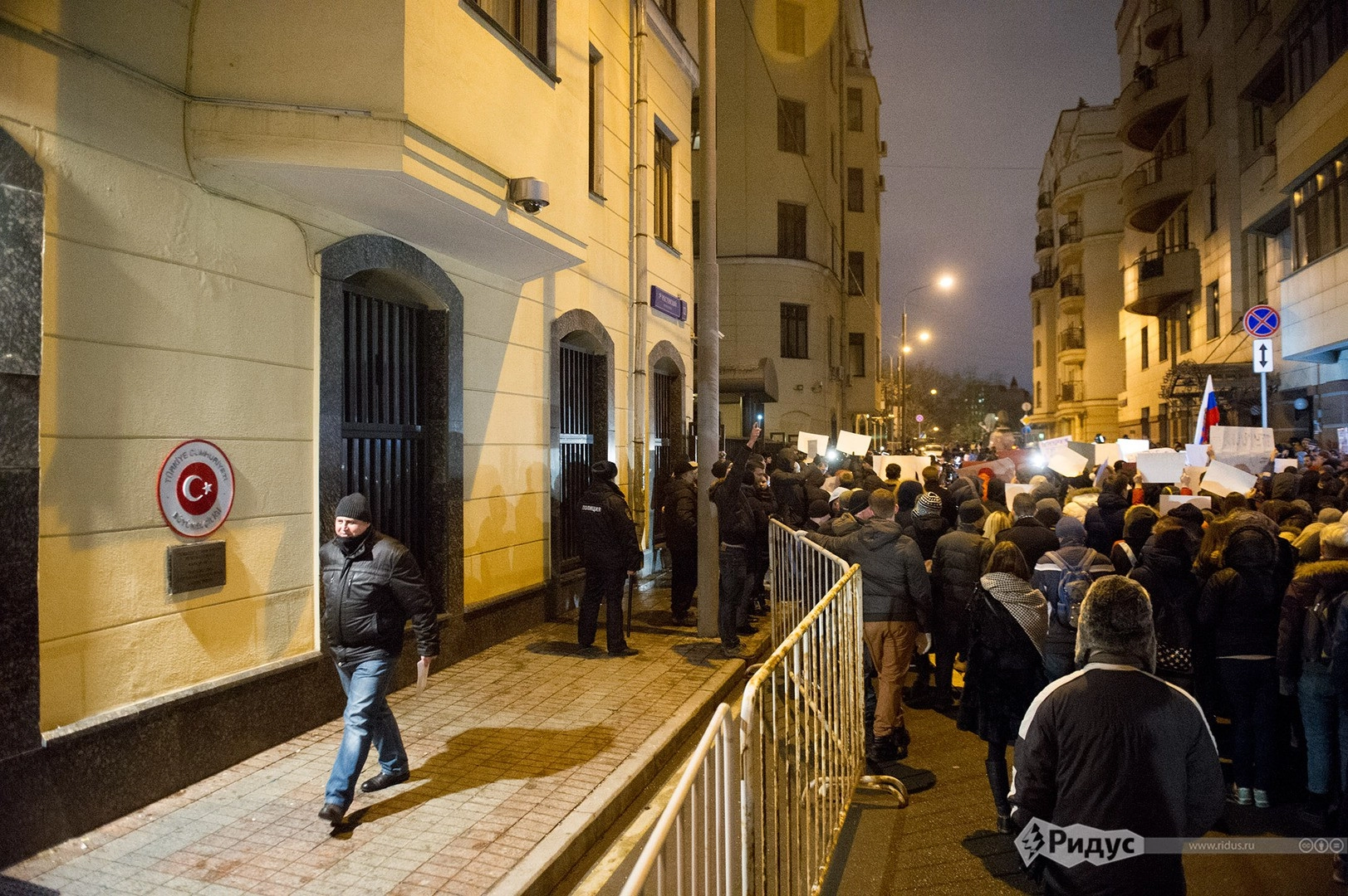 По информации очевидцев, около тысячи человек вышли на митинг у Посольства Турции в Москве. Участники акции требуют призвать страну-члена НАТО к ответу за сбитый в Латакии российский бомбардировщик Су-24 и смерть двух пилотов.