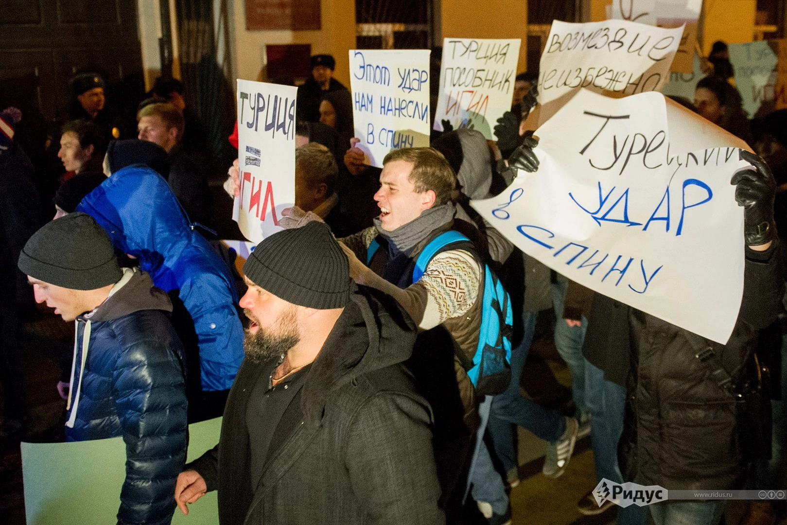 По сообщению корреспондента «Ридуса», который побывал на месте событий, митингующие выкрикивали лозунги «Турция равно ИГИЛ!», «Не забудем, не простим!», «Турция — пособник ИГИЛ!», «Возмездие неизбежно!», а также пускали бумажные самолетики в сторону здания турецкой дипмиссии.