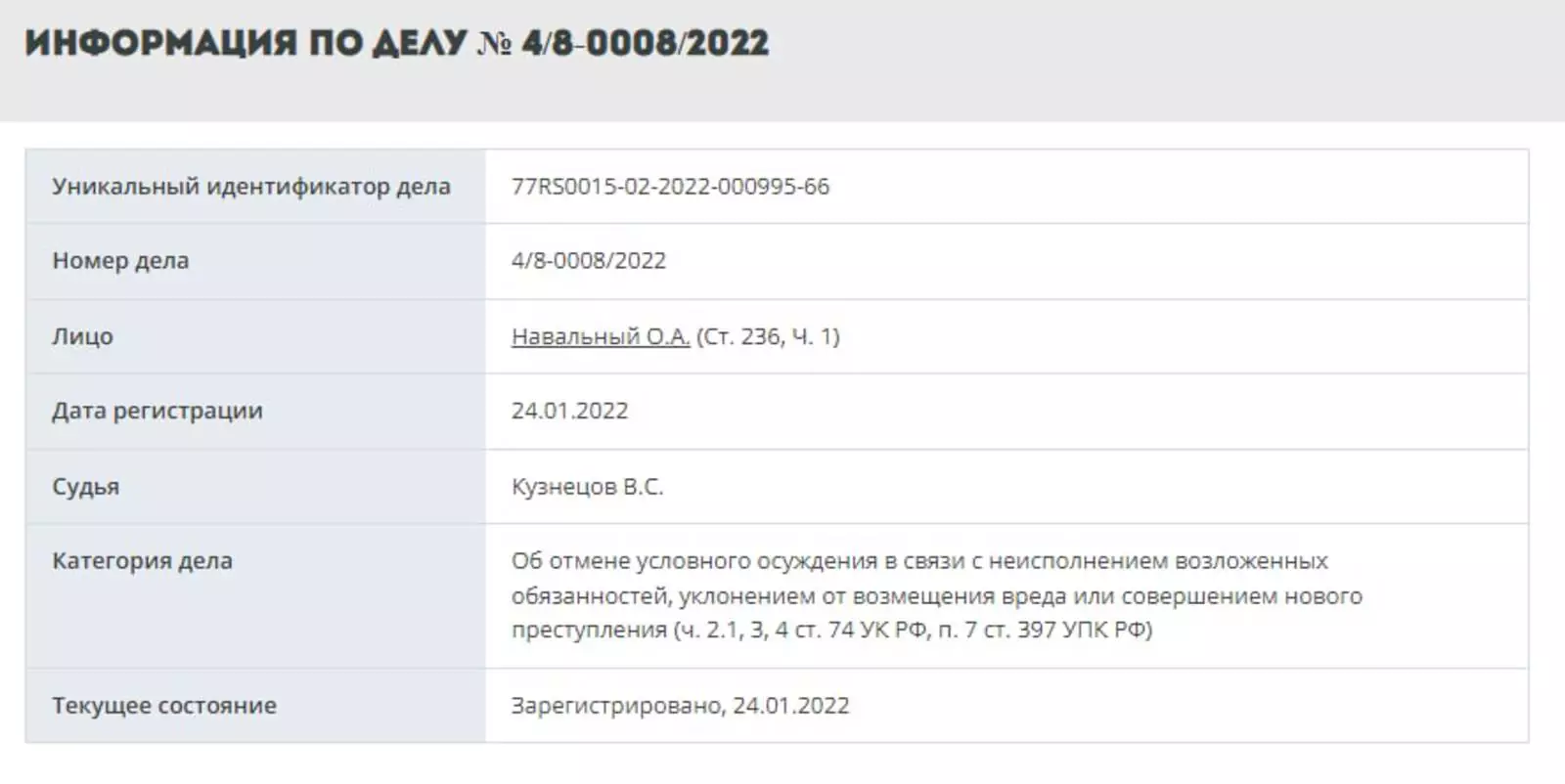 Речь идет об истории с акцией в Москве в январе 2021 года, когда Олег Навальный через соцсети призывал к участию в ней большие группы людей. По версии обвинения, Навальный таким образом нарушил рекомендации по борьбе с коронавирусной инфекцией. Вину он не признал. Преображенский суд Москвы в прошлом году назначил Олегу Навальному год лишения свободы условно.
