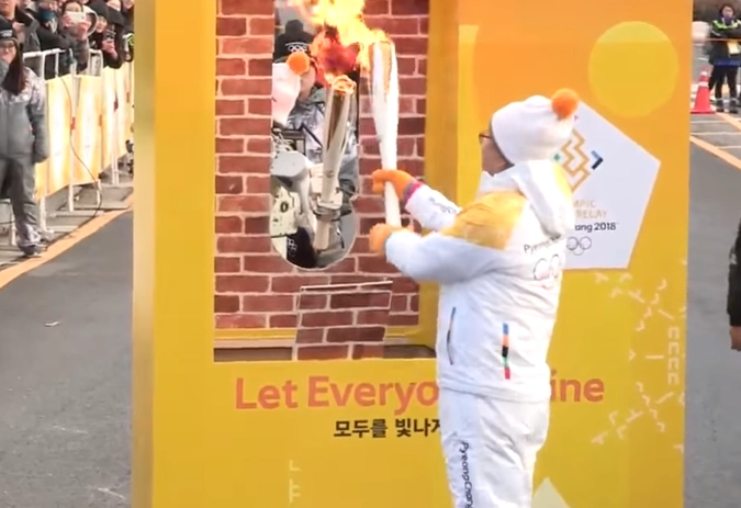 Вырезав небольшую дыру, робот протянул факел профессору О Чун-хо, который следом передал огонь другому корейскому роботу FX-2, которым управлял корейский юноша.