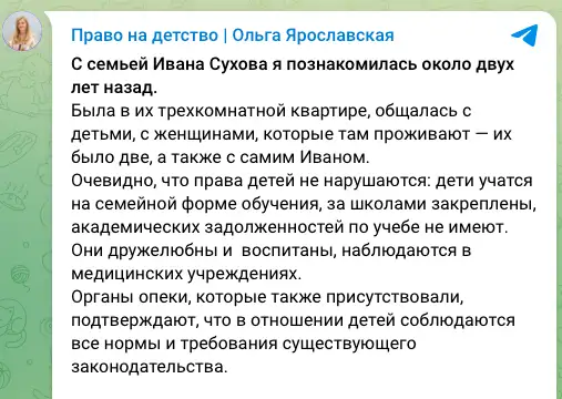 «Была в их трёхкомнатной квартире. Общалась с проживающими там детьми и женщинами, их было две, а также с Иваном. Очевидно, что права детей не нарушаются. Дети учатся на семейной форме обучения, закреплены за школами, академических задолженностей по учёбе не имеют. Они дружелюбны и воспитаны, наблюдаются в медицинских учреждениях», — писала Ярославская в своём Telegram-канале.