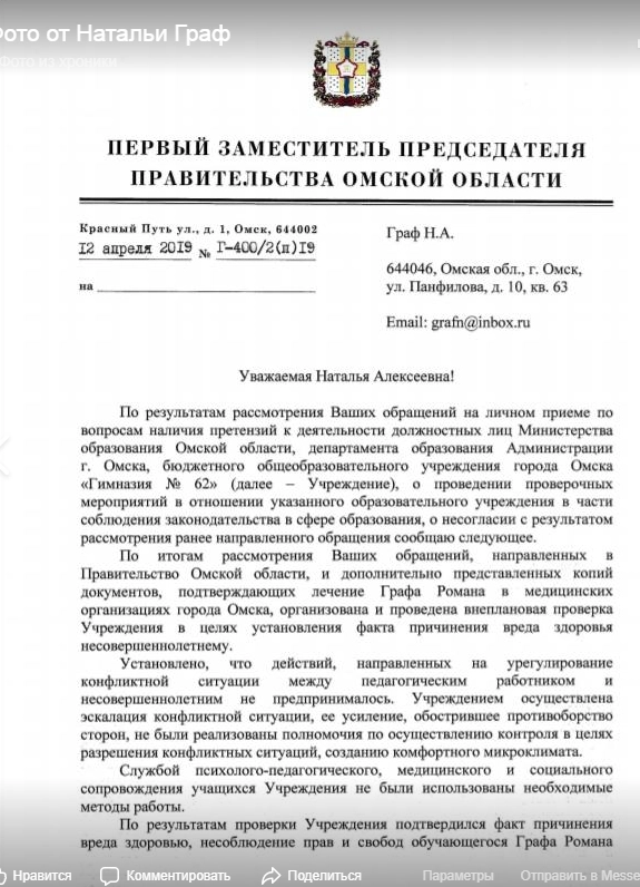 Омская журналистка Наталья Граф получила официальный ответ из областной администрации на обращения о травле, устроенной педагогами городской гимназии № 62 против ее сына Романа.