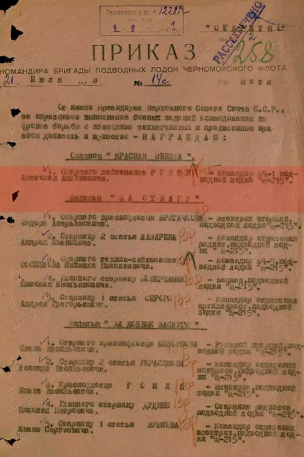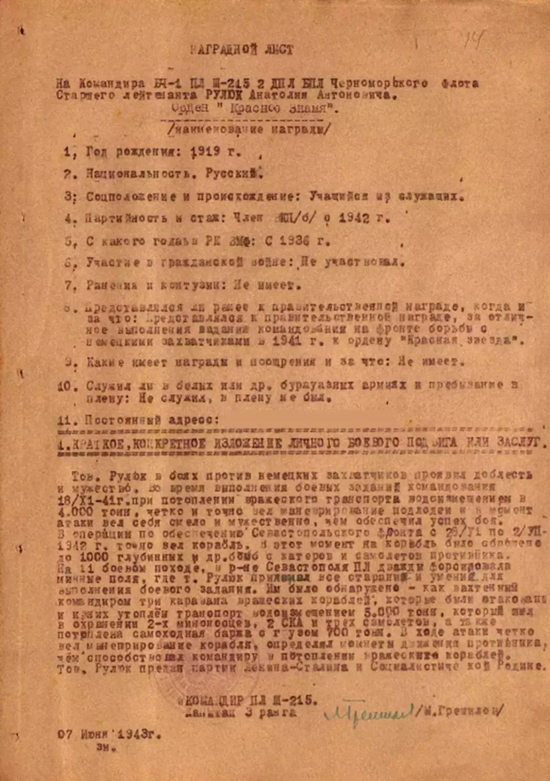 Из представления. Товарищ Рулюк А. А. за период отечественной войны (орфография и пунктуация сохранены) участвовал в 14-ти боевых походах, за время которых при его непосредственном участии потоплено 6 кораблей противника. Своей отличной работой как штурман, обеспечил боевые походы и потопление кораблей противника. Отличный вахтенный офицер. Им обнаружена подводная лодка противника. Несмотря на сложность плавания при большом противодействии ПЛО противника и авиации обеспечил боеспособность плавания подлодки. За потопление транспорта 27 марта 1944 года водоизмещением 5000 тонн и самоходной баржи противника 15 ноября 1943 года представляю товарища Рулюка к награде орденом «КРАСНОГО ЗНАМЕНИ». Все представления были подписаны командиром пл Щ-215 капитаном 3 ранга Михаилом Васильевичем Грешиловым.