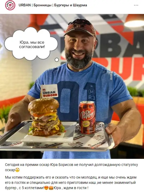 Тем временем несостоявшийся «Оскар» Борисова стал важным источником вдохновения для отечественной SMM-рекламы. На номинации российскому актёру хайпанули все — от Aviasales до бургерной из подмосковных Бронниц.