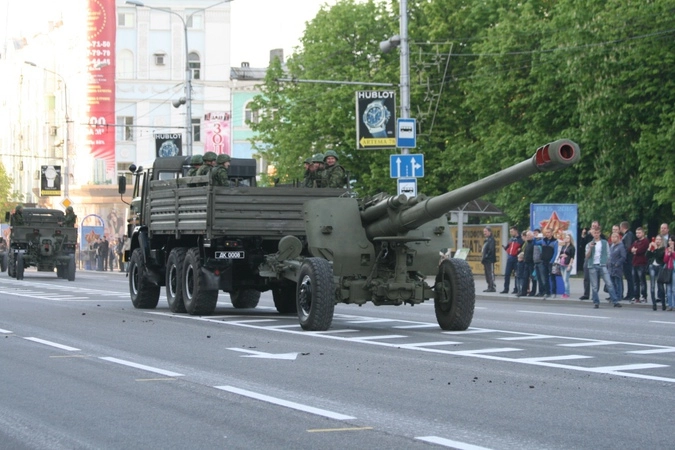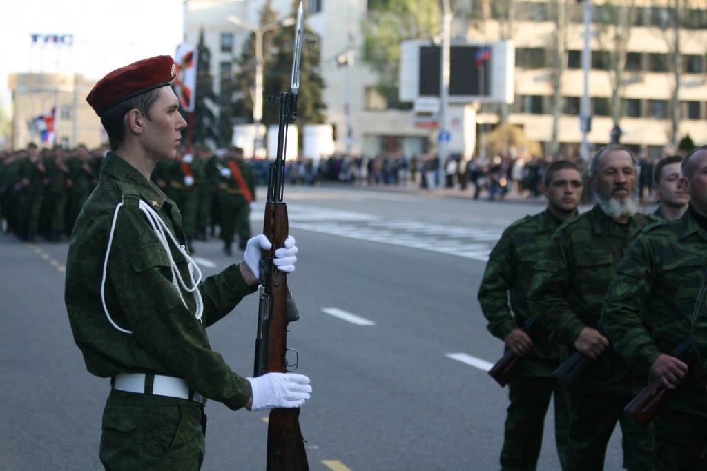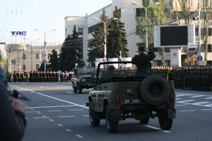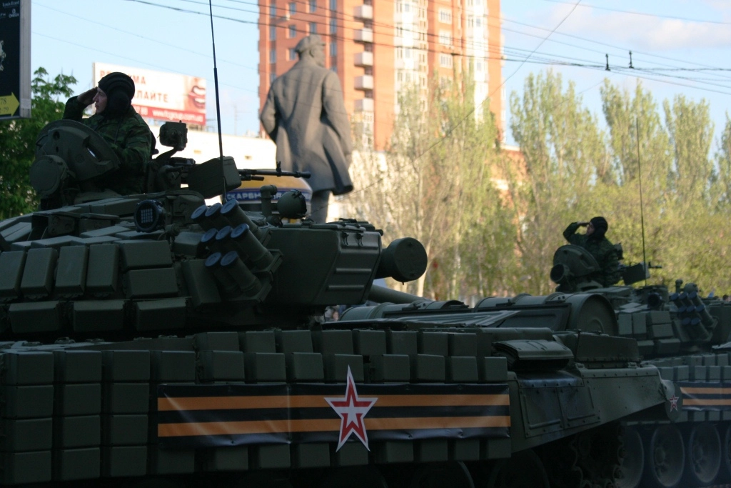 Глядя на Т-72-е, прошедшие сегодня по центральной улице Донецка, понимаешь, что хоть они и выкрашены и не помяты, но это настоящие боевые машины, готовые рвануть в бой, а возможно, какие-то из них и захвачены в бою. Это же можно сказать и о пушках, и о «Градах», и о машинах пехоты, все это настоящее, боевое.