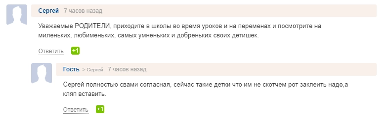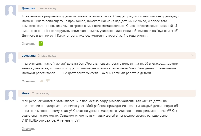 Однако большая часть родителей встала на защиту учительницы. Отец одного из школьников по имени Александр рассказал, что его ребенку «рот никто не заклеивал, потому что адекватно себя ведет, есть „особо“ отличившиеся детки, родителям которых вместо того, чтобы следить и воспитывать своих детей лучше пойти пожаловаться в СМИ».