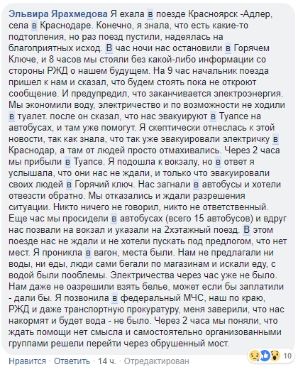 Одна из очевидцев стихийного бедствия написала свою историю в Facebook. Пользовательница рассказала, что случилось с ней после того, как в Краснодаре она села в поезд Красноярск — Адлер: