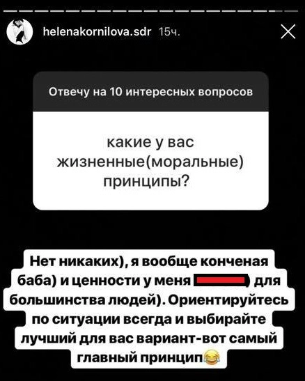 Когда я впервые услышал про Елену Корнилову, молодого талантливого ученого-блогера, а по совместительству натуропата, трансгуманиста и биохакера, ее история произвела на меня неизгладимое впечатление. Она закончила Университет Анхальта, получив степень магистра биологии, Мюнхенский технический университет (TUM) со степенью по органической химии, в настоящий момент она PhD студент в Национальном университете Сингапура (NUS), а дальше собирается, понятное дело, в Стэнфорд. При этом Елене всего 29, у нее модельная внешность и „неограниченные финансовые возможности“. Лишь из любви к ближнему и желания поделиться открытиями с миром Елена ведет блог в Instagram, где раздает связанные со здоровьем советы, о примерном содержании которых можно догадаться и без моей помощи. Елена борется с интоксикациями и старением, для чего изобрела собственные схемы приема БАДов, которые, конечно же, можно купить на iHerb, используя скидочный код Елены, по которому ей начисляется комиссия, — написал Талантов на своей странице в Facebook.