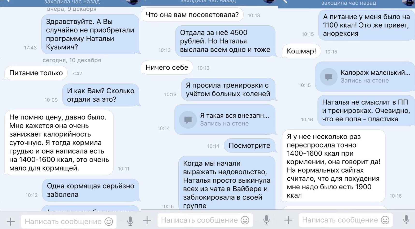 Я создала свой чат, в который пригласила всех нормальных девочек. Там же мы сверили программу и поняли, что получили один и тот же файл. Хотя были кормящие мамочки. И девушки с травмами спины, коленей и т. д. Далее я начала вести подрывную деятельность и искать других пострадавших от деяний Натальи. И нашла. Долго искать не пришлось. Так и появилась эта группа. Иногда мне хочется забить на все и перестать этим заниматься. И в этот момент мне пишет очередная пострадавшая, у которой пропали месячные или которую за безобидный вопрос в группе Натальи забанили. И тогда я понимаю, что занимаюсь правым делом, — сообщила в Сети Наталья Моисеева, недовольная покупательница фитнес-программы Кузьмич.