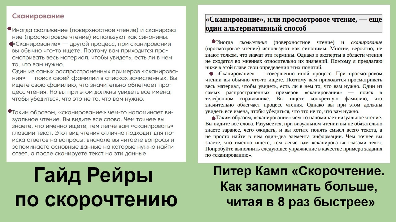 На всякий случай решил проверить, является ли материал оригинальным. Я копировал абзацы из гайда и искал их в поисковых системах. Оказалось, что 99% гайда дословно находится в интернете. И это два источника: книга Питера Кампа „Скорочтение. Как запоминать больше, читая в 8 раз быстрее“ и сайт 4brain.ru, — сообщил он.