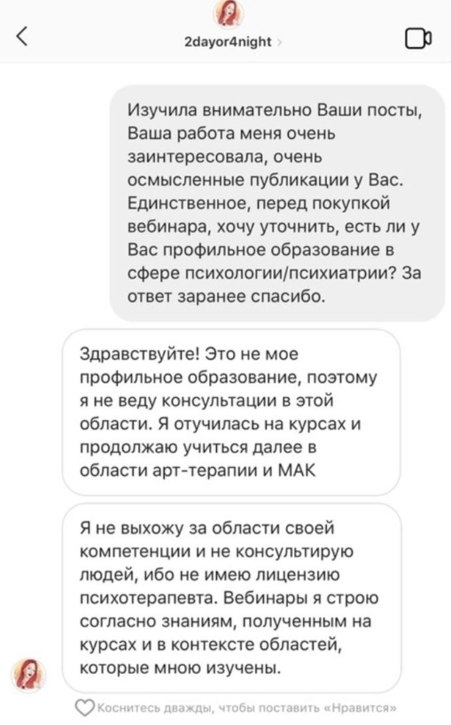 В Instagram огромное количество „психологов“, которые на вопрос об образовании либо блокируют в ответ, либо в наглой форме отвечают, что это вас не касается, — заключила она.