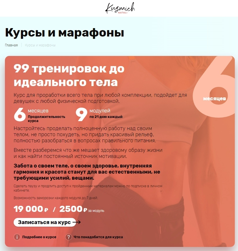 В соцсети есть целая группа с жалобами на сетевого фитнес-тренера Наталью Кузьмич, которая, по ее словам, смогла сделать себе идеальную фигуру дома всего за полгода. Как пишет девушка на своем сайте, она занималась спортом, пока ее ребенок спал. Обладательница роскошной фигуры продает свои онлайн-программы, стоимость которых на данный момент — от 3500 до 19 000 рублей, а также ведет блог в Instagram. И таких блогеров в Сети сотни.