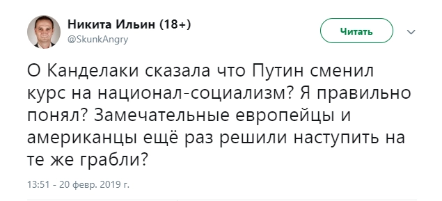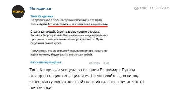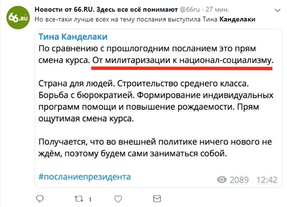 По сравнению с прошлогодним посланием это прям смена курса. От милитаризации к национал-социализму. Страна для людей. Строительство среднего класса. Борьба с бюрократией. Формирование индивидуальных программ помощи и повышение рождаемости. Прям ощутимая смена курса, — написала она в соцсетях.