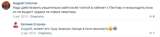 Недовольство Пестова вызвала Евгения Егорова, местная активистка. 3 августа прошлого года городском сообществе «Типичный Подольск» «ВКонтакте» она обсуждала сюжет о проблемах земляков, живущих в аварийном доме, и несколько раз попрекнула мэра города лишним весом.
