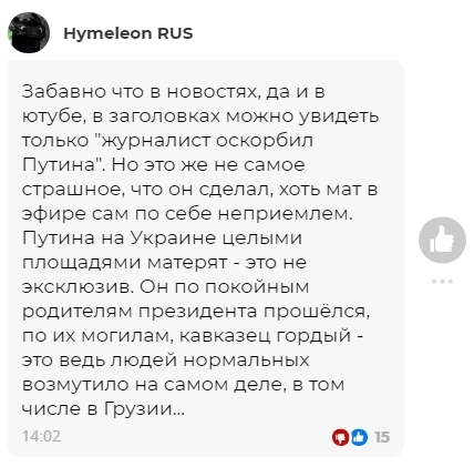 Как ранее рассказывал «Ридус», Габуния в начале своей программы заявил, что передает «привет» Путину, а затем начал нецензурно выражаться. Во время ругани он упомянул, в том числе, мать Путина. Премьер-министр Грузии Мамука Бахтадзе и гендиректор телеканала Ника Гварамия решительно осудили слова журналиста. В свою очередь, пресс-секретарь российского президента Дмитрий Песков сказал, что в Кремле оскорбления в адрес России и Путина считают неприемлемыми.