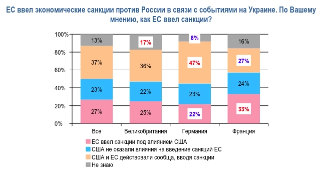 Как видно на графике, 27% европейцев ответили, что ограничительные меры были приняты под влиянием Соединенных Штатов, 37% опрошенных считают, что Евросоюз и США в вопросе введения санкций действовали сообща. Примечательно, что почти половина населения опрошенных стран считает, что ЕС должен действовать более независимо от США. Только 15%, наоборот, считают, что ЕС должен больше прислушиваться к мнению из-за океана: